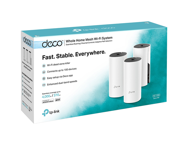 Deco M4 is the simplest way to guarantee a strong Wi-Fi signal in every corner of your home up to 4,000 square feet*. Wireless connections and optional Ethernet backhaul work together to link Deco units, providing even faster network speeds and truly seamless coverage. Want more coverage? Simply add another Deco.