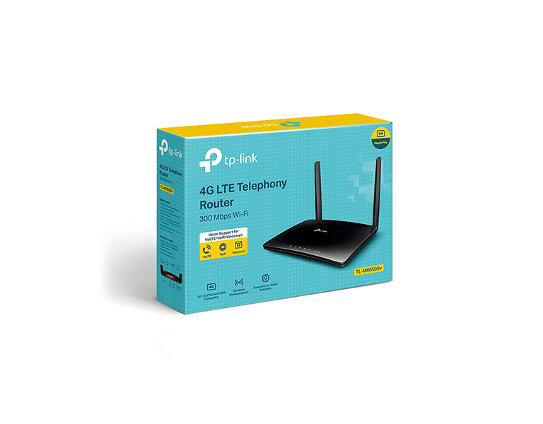 | Package Contents | 300Mbps Wireless N 4G LTE Telephony Router TL-MR6500v Power Adapter RJ45 Ethernet Cable RJ11 Cable Quick Installation Guide Telephony Feature Guide |