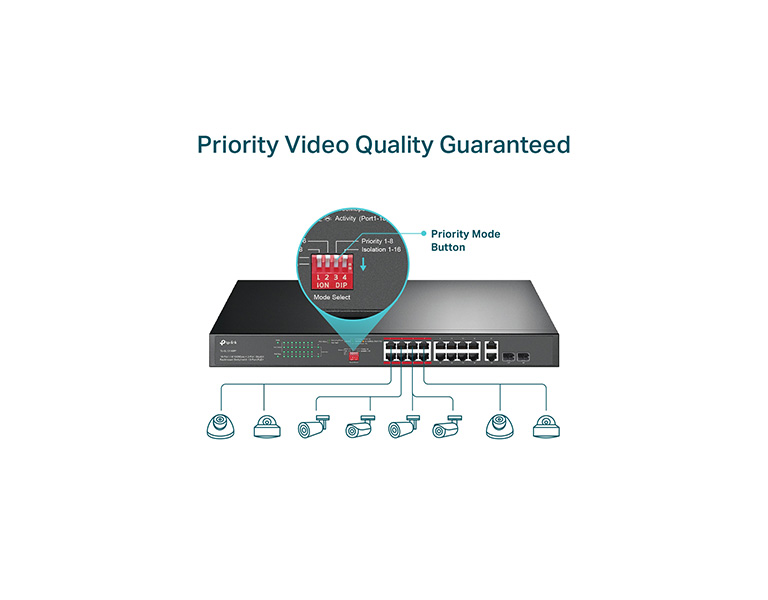 | • 16× PoE+ 10/100 Mbps RJ45 ports, 2× Gigabit RJ45 ports, and 2× combo Gigabit SFP slots. • High PoE power budget with up to 30 W for each PoE port and 250 W for all PoE ports. • Up to 250 m data and power transmission under extend mode specially designed for surveillance system. • Priority mode for ports 1–8 to guarantees the quality of sensitive applications like video monitor. • Isolation Mode allows one-click client traffic separation for higher security and performance. • Easy to use, with no configuration and installation needed. |