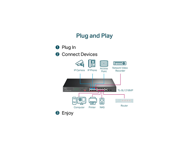 Compliance with the 802.3af/at PoE+ standard supports up to 30 W on each PoE port. The total 250 W PoE power budget for the 16× PoE+ ports makes it has wide range of applications, such as surveillance, offices, dormitories, and small businesses. It is fully compatible with IP cameras, access points, IP phones, computers, printers, and etc.